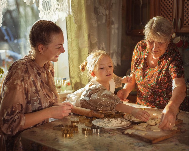 На фото прабабушка, внучка и правнучка собрались в выходной и занимаются увлекательным делом - стряпают печенюшки, особенно это нравится девчушки! Это очень по-семейному!