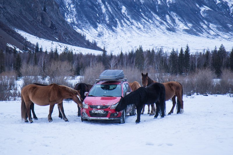 Автомойка по-алтайски. Если оставить машину в удаленном от цивилизации уголке Алтая, можно по приходу обнаружить её вылизанной лошадьми, ну и погнутый госномер.