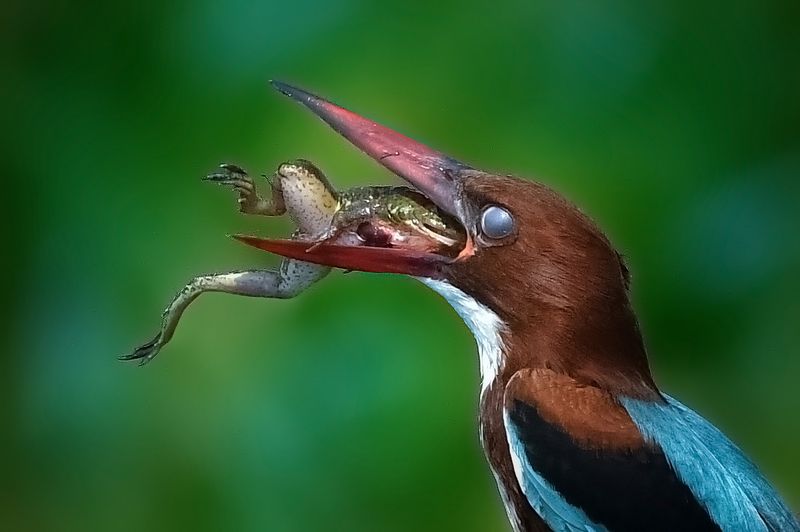 I captured this remarkable moment from Purbasthali Bird Sanctuary, West Bengal, India. A White-throated Kingfisher was sitting on a perch with a Frog hunt. The kingfisher consumed the frog wonderfully. At first, the bird killed the hunt by its sharp beaks, moved the frog body in its mouth for a while. At last, the bird became successful to swallow the frog totally. The whole process took approximately 15 minutes. The Sighitng was really a notable experience for me. I made a series of the whole. This image is from that series. By the way, in spite of being named as kingfisher, the bird always prefer frog, reptiles, crabs etc as its food & generally avoid to hunt fishes.. So this bird breaks the "stereotypes" of other kingfishers by avoiding fishes, isn't it??