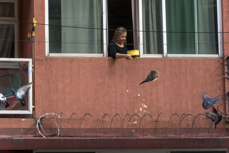 Next to my building there is a lady who twice a day feeds a large group of pigeons who wait to see her come out of her through the window with pieces of tortillas. Mexico City
