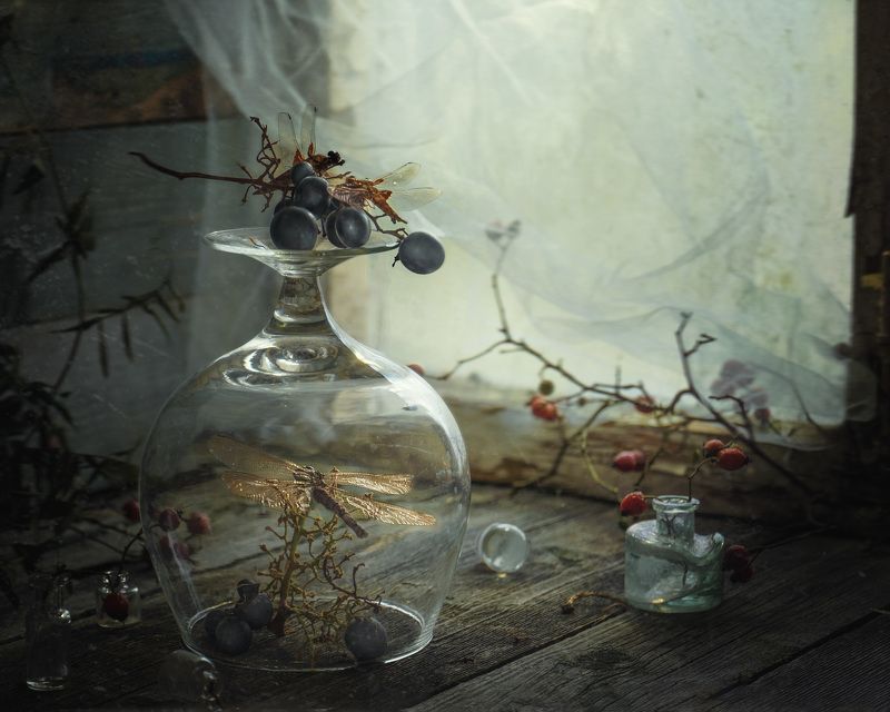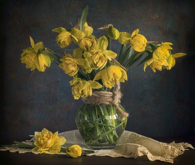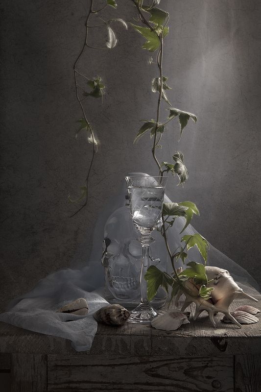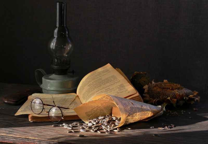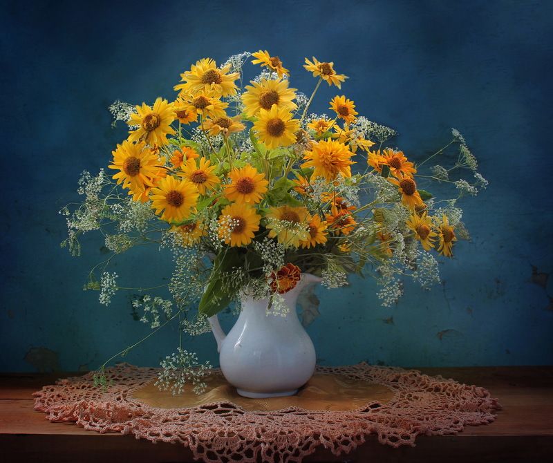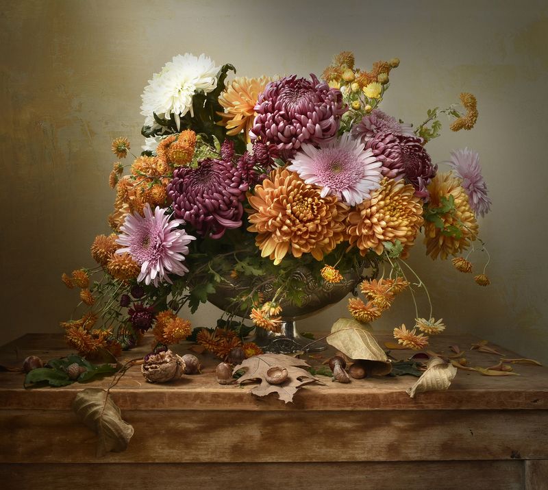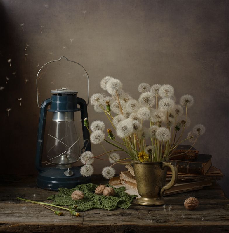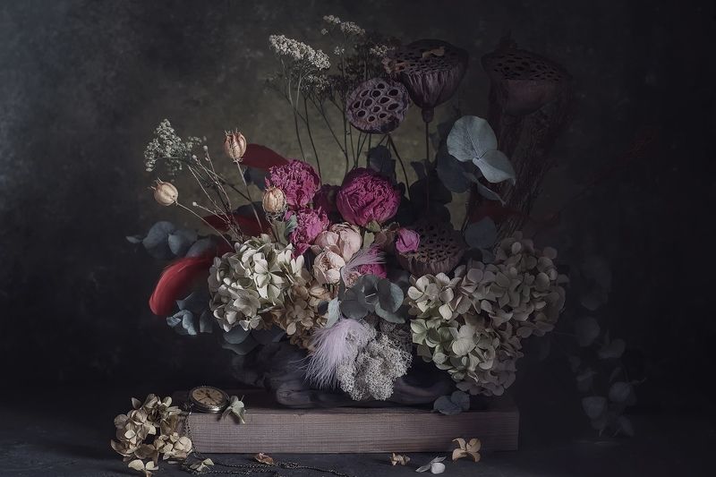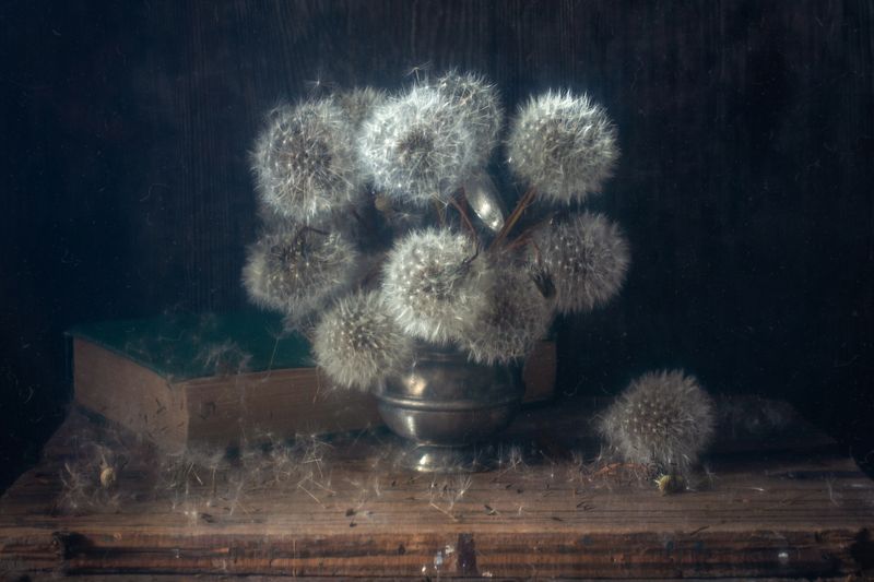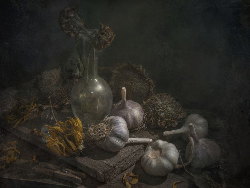 Эту композицию я собирала из зрелых и увядающих подсолнухов. Подобно тому, как стареющая женщина грустит, глядя на свое отражение в зеркале, мои подсолнухи склонили грустные головы и ни один из них не смотрит на зрителя. Они печалятся о том, что их лепестки уже не так упруги и пышны, как в дни юности. А зритель видит красоту в этом увядании, видит созревшие семена - то, что эти цветы оставят после себя. И этот натюрморт - мой призыв не бояться естественного хода вещей, не бояться возрастных изменений внешности, ведь в человеке, как и в цветке, красоту можно разглядеть вне зависимости от его возраста