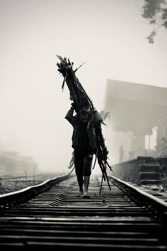 In the ethereal embrace of a wintry fog, a lone figure strides along the deserted railroad track, determination etched on his face. Clad in layers against the biting cold, he pulls a load of firewood, creating a stark contrast against the muted surroundings. The diffused light lends an almost mystical quality to the scene, as the fog wraps the landscape in a hushed silence. Each step leaves a faint imprint on the damp ground, telling a story of resilience in the face of the chilling mist, and the timeless rhythm of a man and his labor against the atmospheric stillness of a cold, fog-laden morning