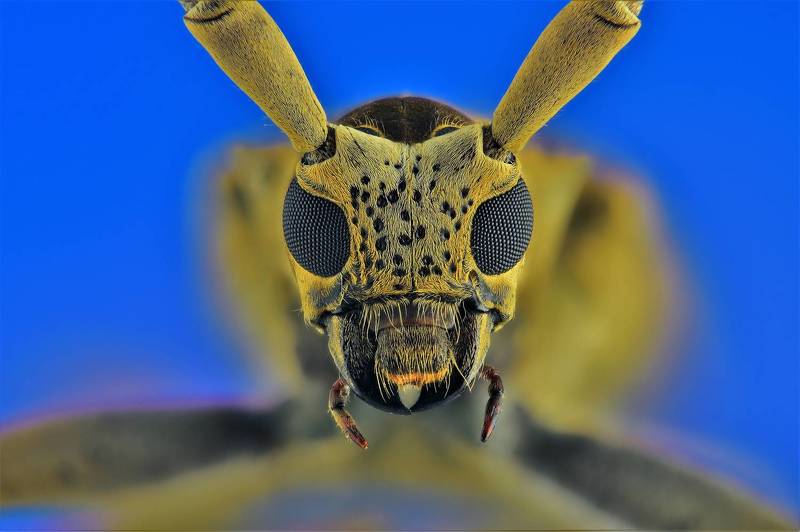 This macro-photograph features a Long horn beetle, also known as long-horned or longicorns. The extremely long antenna, which is often as long as or longer than its body gives makes it stand out among other beetles. The snap tries to capture it with emphasis on minute features, in the natural habitat.