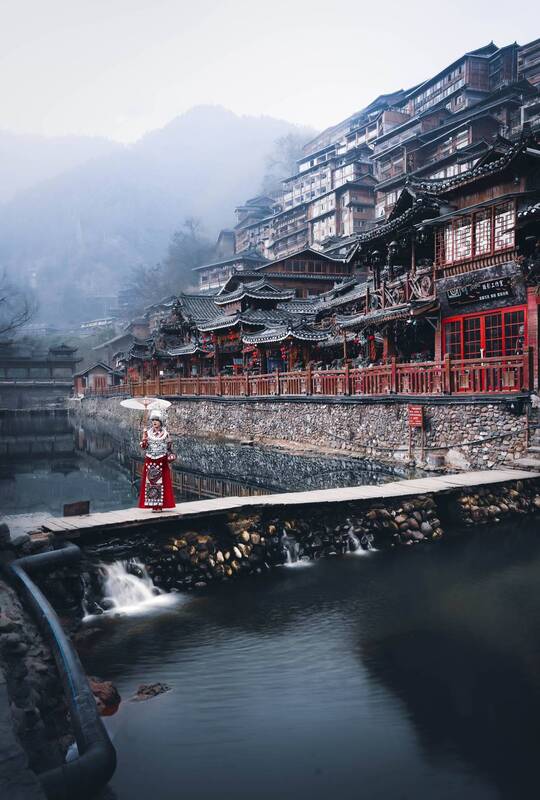 This photo was taken in Qiandongnan Miao and Dong Autonomous Prefecture, Guizhou, China, which is the largest gathering place of Miao people in China. The Miao girl passing by in the picture perfectly blends with the ancient building behind, while the faint green mountains and flowing water make the picture even more full. Coupled with the morning mist, the painting adds a mysterious and magical color, resembling being in a secluded and ancient dream city.