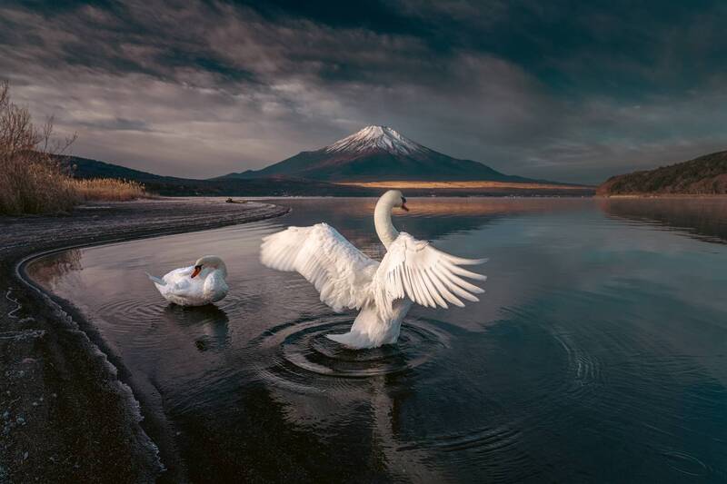 The dance in my dream. Couldn\'t believe that the swan just started shaking its feathers in front of me, with the massive Mt Fuji as the backdrop. What a dreamy scene.