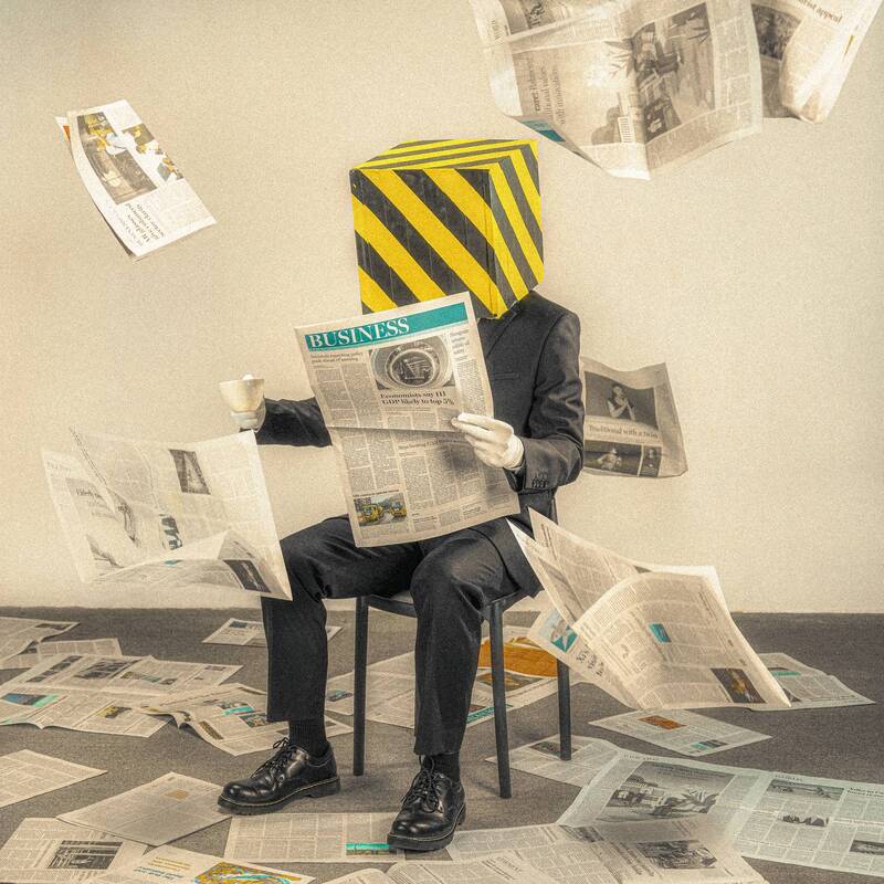 Holding coffee in his hand and watching the incomprehensible news is like wearing a box and sitting on top of an absurd grass platform. Maybe when we take the box, we are still children, just pretending to be adults.