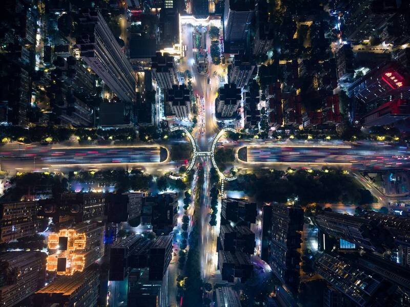 Creative idea: This work is taken from a night view of Guangzhou, China, capturing the rapidly developing city and developed transportation through aerial photography. Using a central composition, it expresses the accelerated rise of Chinese technology
