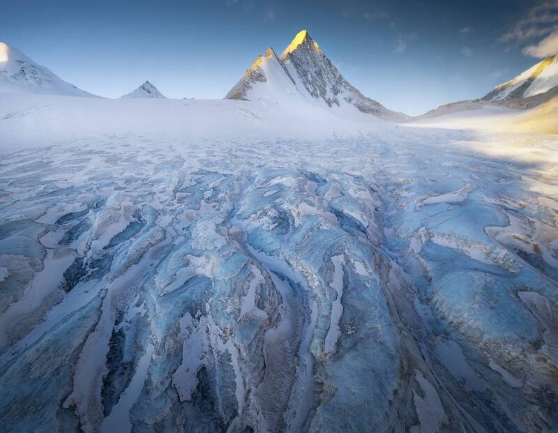 Captured at King Peak, Gangdise Range, this aerial perspective documents glacial upstream features through drone photography, contrasting with common mid-stream serac formations. The composition highlights azure crevasses merging with the peak\\\'s geological architecture.
