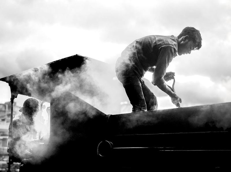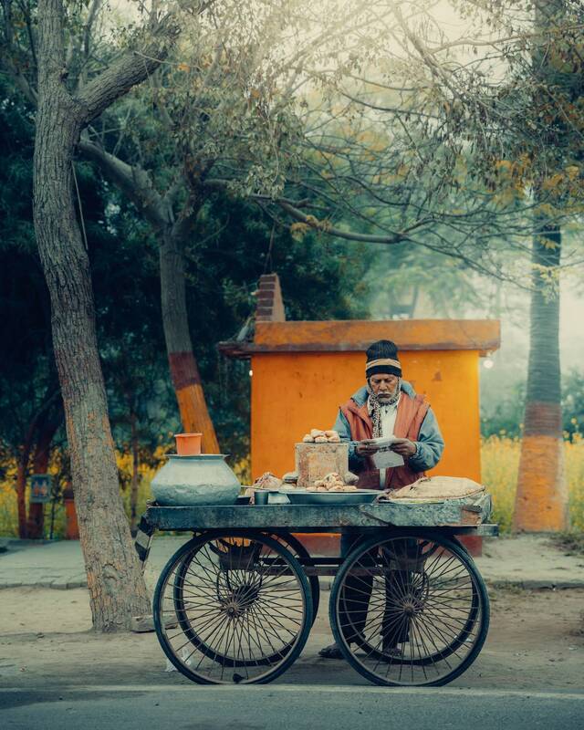 A lifetime etched in every wrinkle, a story in every gaze—this portrait captures more than just a moment; it captures a soul. The elderly man, lost in thought, holds his cigarette gently, the swirling smoke mirroring the passage of time. His weary yet piercing eyes speak of resilience, of days gone by, of wisdom earned the hard way. The worn-out shop behind him, the Tamil letters on the sign, the scattered crumbs on the table—all add to the narrative of a life well-lived, a quiet pause in an ever-moving world. This is not just an image; it is a window into a journey.