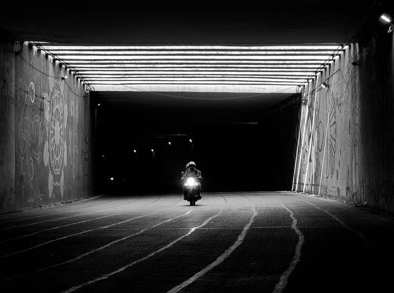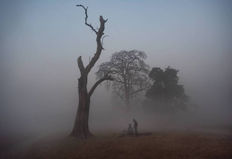 In this black-and-white photo, two dogs are sitting on a stone platform, facing away from each other. The dogs are in the foreground, and their distinct black and white fur patterns are clearly visible. They both appear calm and alert, looking in opposite directions. The background is enveloped in a thick, misty fog, creating a mysterious and serene atmosphere. In the distance, partially obscured by the fog, are two figures on horseback. The riders are barely visible but add an intriguing element to the scene. They seem to be moving through the mist, which gives the impression of a dreamy or ethereal journey. Behind them, a tall, slender building looms, shrouded in the fog, adding to the sense of depth and scale in the photo. The setting is the Maidan in Kolkata, known for its vast open space and greenery. During winter mornings, the Maidan often experiences dense fog, creating scenes like this one. The photograph captures the quiet and tranquil beauty of a winter morning in Kolkata, with the fog adding a touch of magic and mystery to the everyday life of the city.