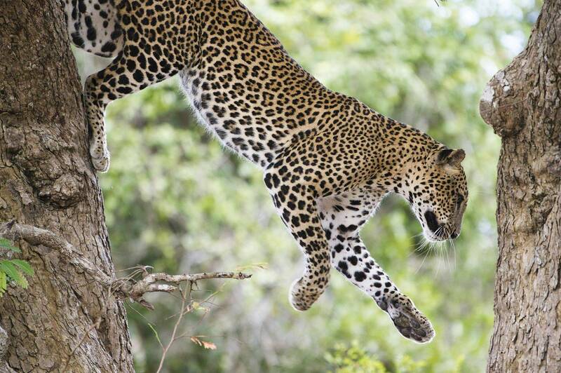 This young leopardess was encountered during a visit to yala national park (block 5) last year. We were closely observing her for more than half an hour during the noon. She climbed up to this tree trying to catch a group of grey langur monkeys who were there on the top. Hunt was failed and she went empty handed. While she was in action, I was able to capture her in flight and it was against the light
