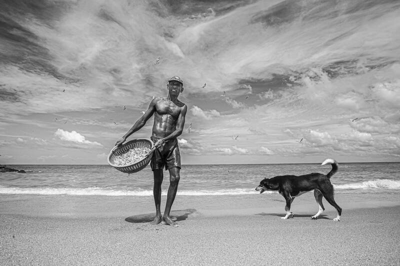 This is a black and white photograph depicting a fisherman on a sandy beach with a dog nearby. This photo was taken at Negombo Beach, Sri Lanka.The dog, which has a dark coat with a white-tipped tail, is walking beside him, seemingly engaged with the scene.