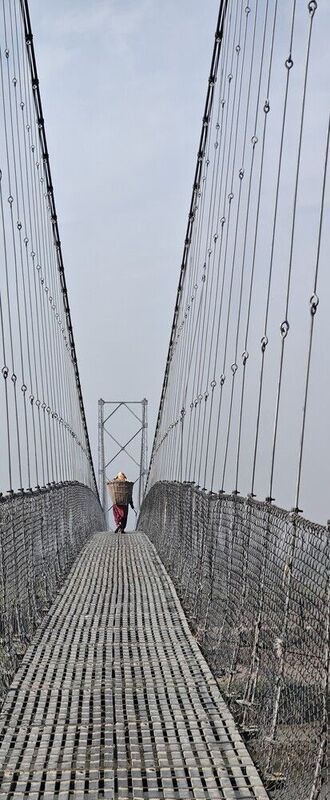 A woman crosses a border bridge between Nepal and India after collecting fodder for her cattle in the evening. It is a regular routine for women on both sides to make intercountry journeys across this bridge to sustain their livelihoods.