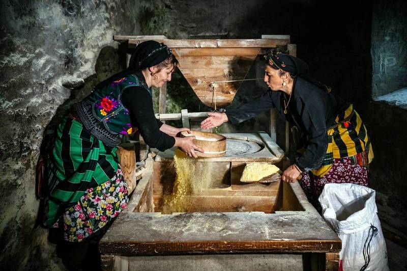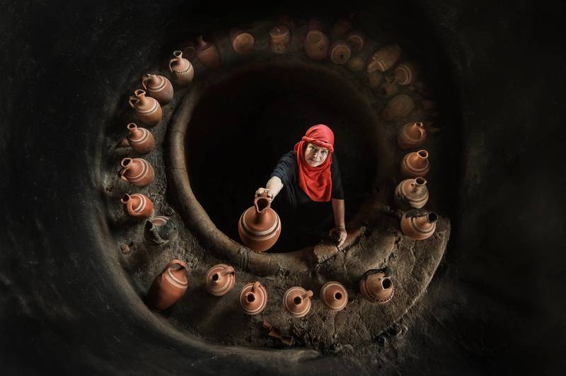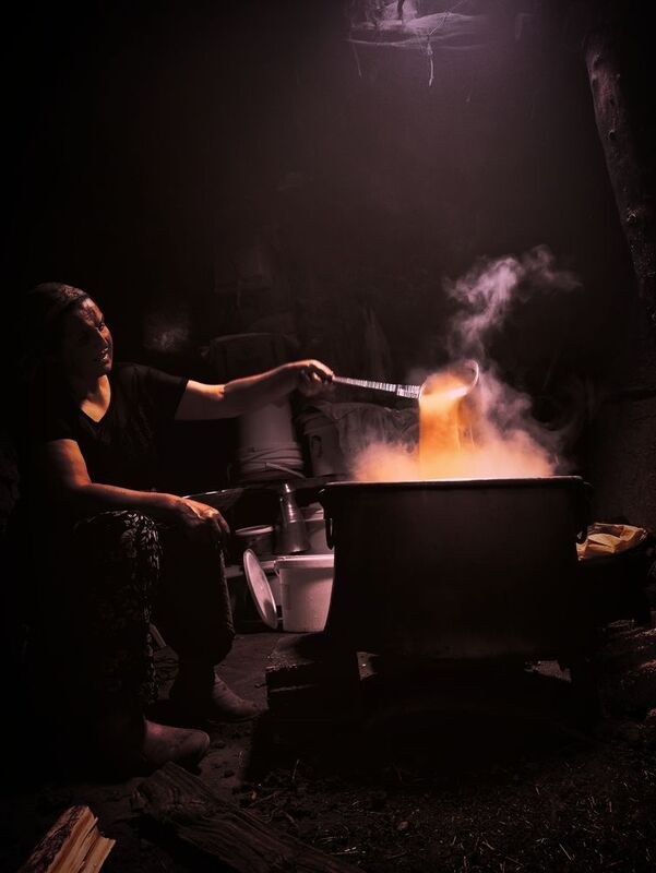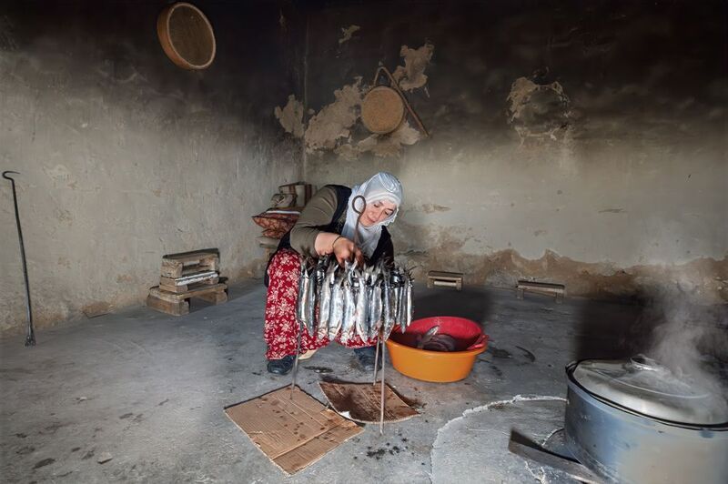 In the woman\'s hands, the traces of the past awaken. The fish, like a gift from the earth and the sea, await their turn in the stone oven. Each fish, a symbol of a patiently crafted story, a timeless moment.