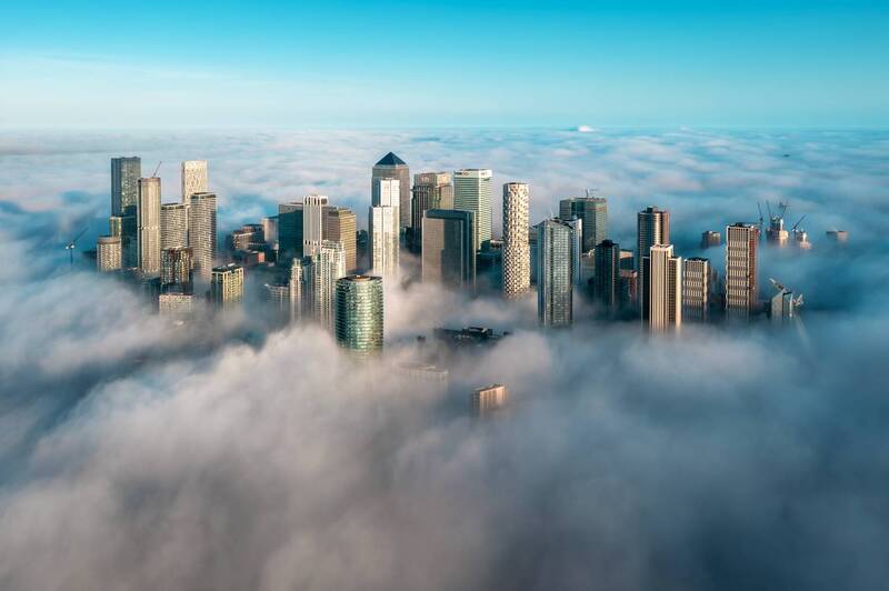 На рассвете небоскрёбы Canary Wharf прорываются сквозь густую пелену тумана, словно острова в бескрайнем море облаков. Эта аэрофотография передаёт уникальную магию утреннего Лондона, где современная архитектура встречается с природной стихией, создавая неземной пейзаж.