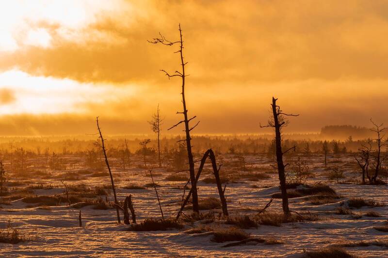 Снег и лед сковывает северный лес и создает живописные виды вдоль небольших порожистых речушек. Ночью, в свете Авроры они начинают играть изумрудными и лиловыми красками, отражаясь в темной воде.