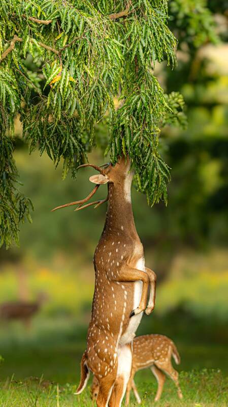 A spotted deer rises effortlessly on its hind legs, stretching towards the lush canopy to grasp a well-earned bite. This captivating moment reflects nature’s quiet determination, where survival is a blend of instinct and adaptability. The warm golden light and soft background enhance the elegance of this scene, highlighting the delicate balance between grace and resilience in the wild.
