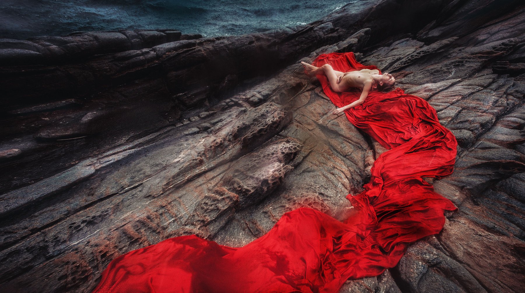 Фотография сделана в Тайланде на острове Ко Рин. У нас с моделью был час времени, желание пофотографироваться, огромный отрез шелка и скалы. Добравшись до места съёмки в километре от основного пляжа мы принялись раскладывать ткань- но мы же в Азии!! В небе загромыхало и вода стеной обрушилась на нас, Алиса лежала на камнях как будто вбирая в себя энергию природы, по моей спине бежали мурашки от восторга и прохлады дождя. Я сделала несколько кадров подняв фотоаппарат выше своего роста, не глядя в видоискатель , так как мокрым было всё-камера, объектив, мое лицо.Думаю что вышло круто.