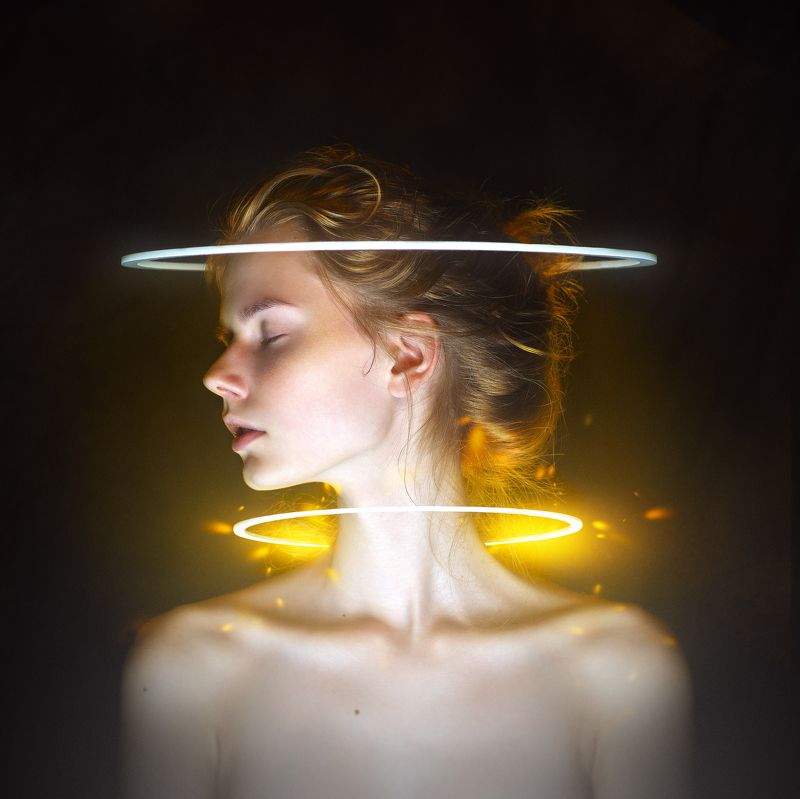 Работа сделана при помощи реальных акриловых колец. Спереди снизу подсветка софтбоксом, сзади постоянный мощный видеосвет.
