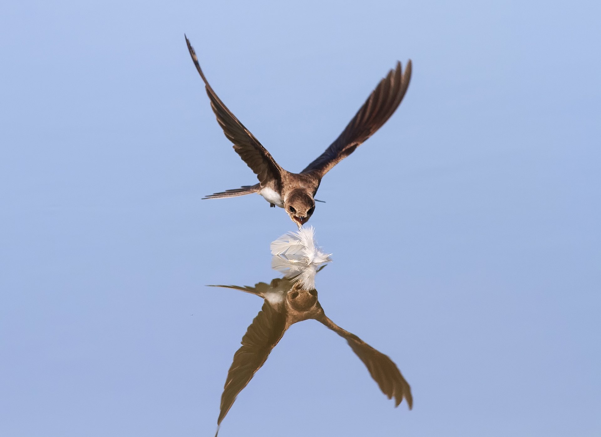 Скопа охотясь пикирует и врезается в воду, уходя вглубь полностью... Через мгновение она появляется вновь, уже с добычей, и затем, сделав несколько мощных взмахов крыльями, вырывается из воды и улетает.