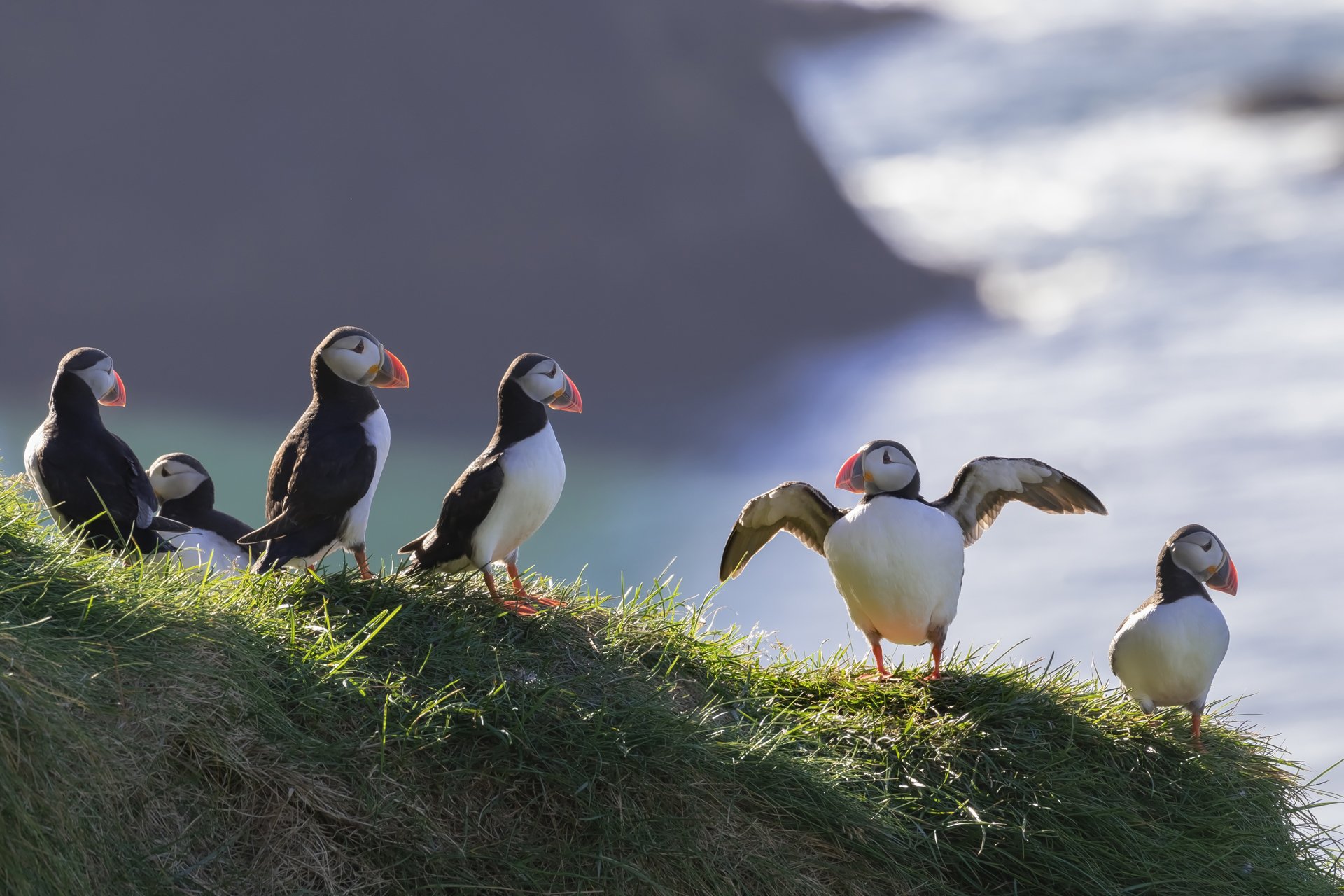 Чтобы сделать этот кадр пришлось карабкаться на почти отвесный утёс. Но тупики, которых еще называют арктическими попугаями, не разочаровали, и удивили своим эмоциональным общением с сородичами. Порой даже возникало ощущение, что они все понимают как люди. Что-то рассказывают друг-другу, удивляются, ругаются, обижаются...