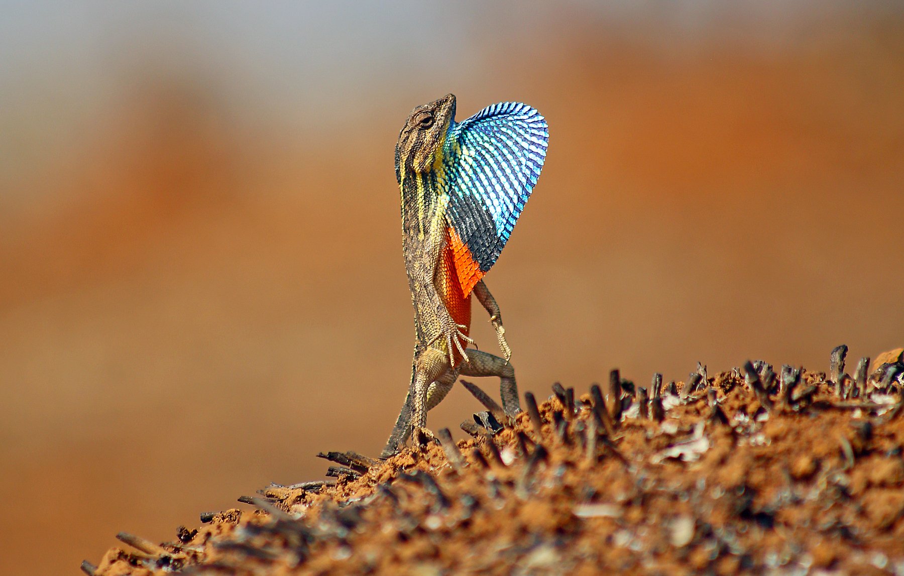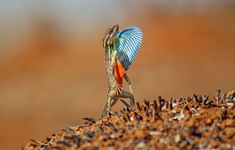 The Fan-throated Lizard Sitana ponticeriana is a beautiful agamid found in most parts of India, Pakistan, Sri Lanka & Nepal. These gentle agamids are colorful dragons of the modern world. These lizards have a thin flap of skin called a gular appendage, between their throat and their abdomen which they can flap/ flash at will. Normally these appendages are whitish or creamish in color, but what’s interesting is that during the breeding season (mainly May-June) the males of these species develop a wonderful coloration ranging from blue-black-red. They take positions over small rocks or branches on the ground and flash their brightly colored gular appendages to attract other females and also to warn off other males about their territory
