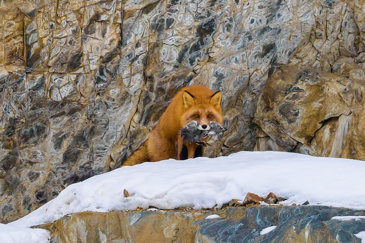 Снимок был сделан в ноябре 2016 года в Магаданской области.Добычей лисы оказалась белка.