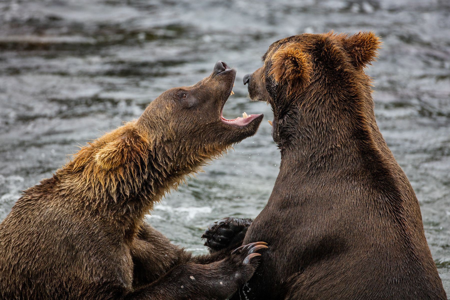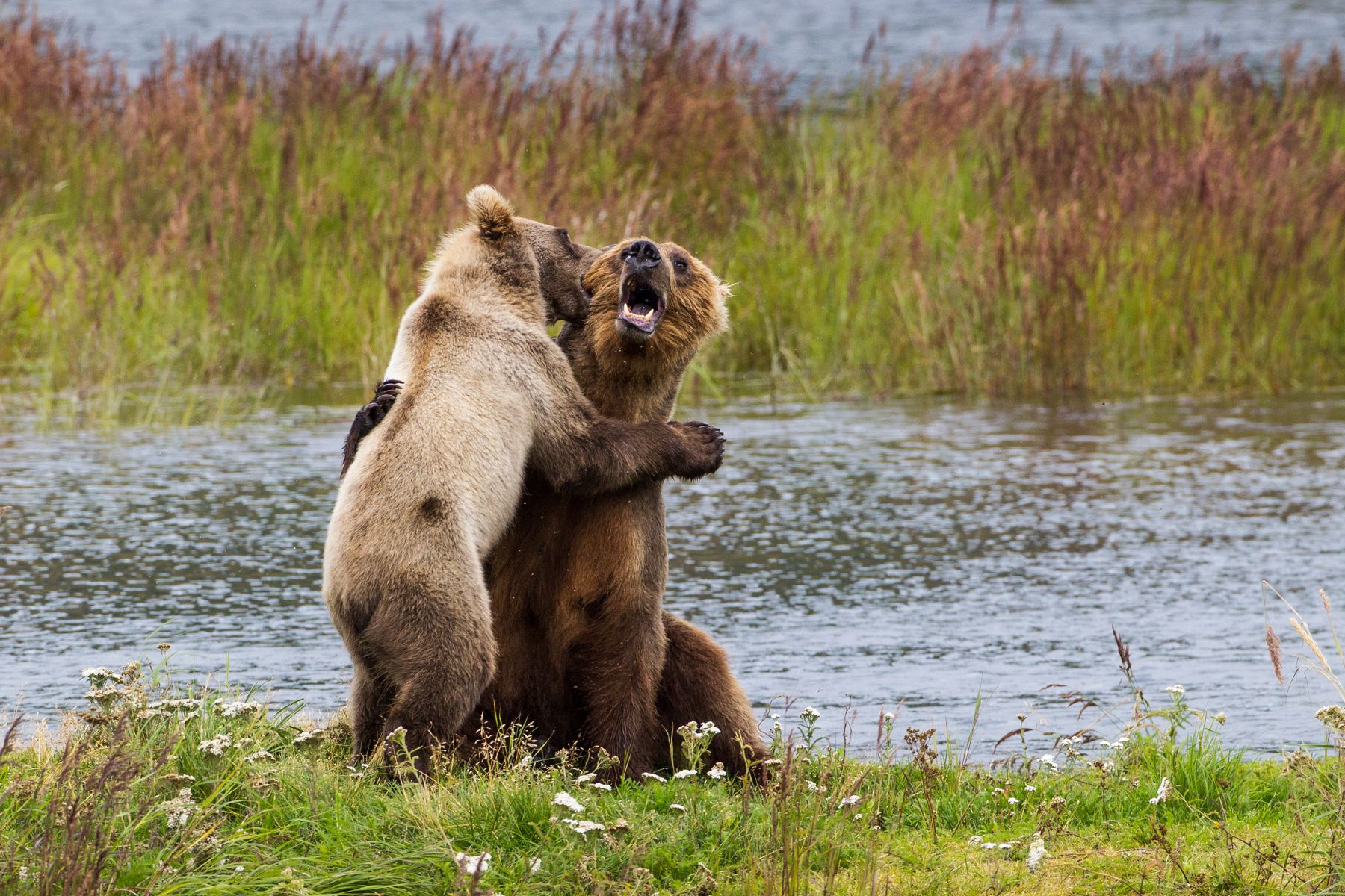 Косолапые - лучшие лицедеи среди зверей. Ни собаки, ни обезьяны без человечьей дрессировки не способны так ярко выражать притворные эмоции. Их бои - в 95% случаях потешные, без увечий и членовредительства, хотя со стороны смотрятся как битвы не на жизнь, а на смерть. Рычание, сопение, разверстые пасти - и ни одной капли пролитой крови. Камчатка, Курильское озеро, сентябрь.