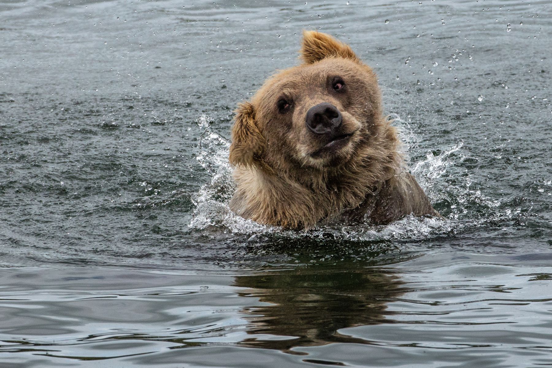 Лосось - основной корм для Сахалинских медведей. Наевшись, медвежата начинают баловаться и играть с рыбой