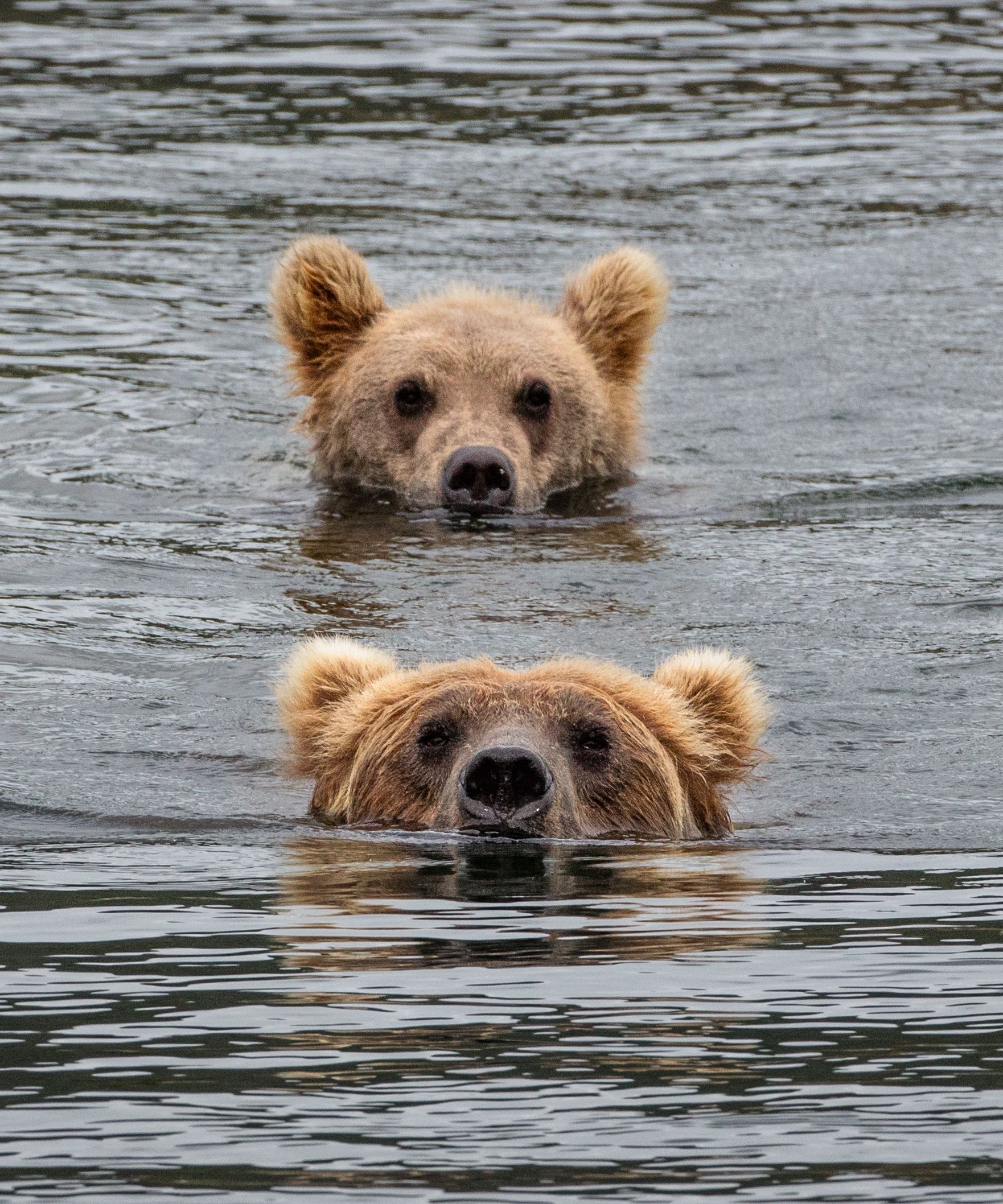 Рано утром медведи выходят к озеру в места нереста лосося, чтобы наловить рыбы. Медведицы выводят на завтрак весь свой выводок..