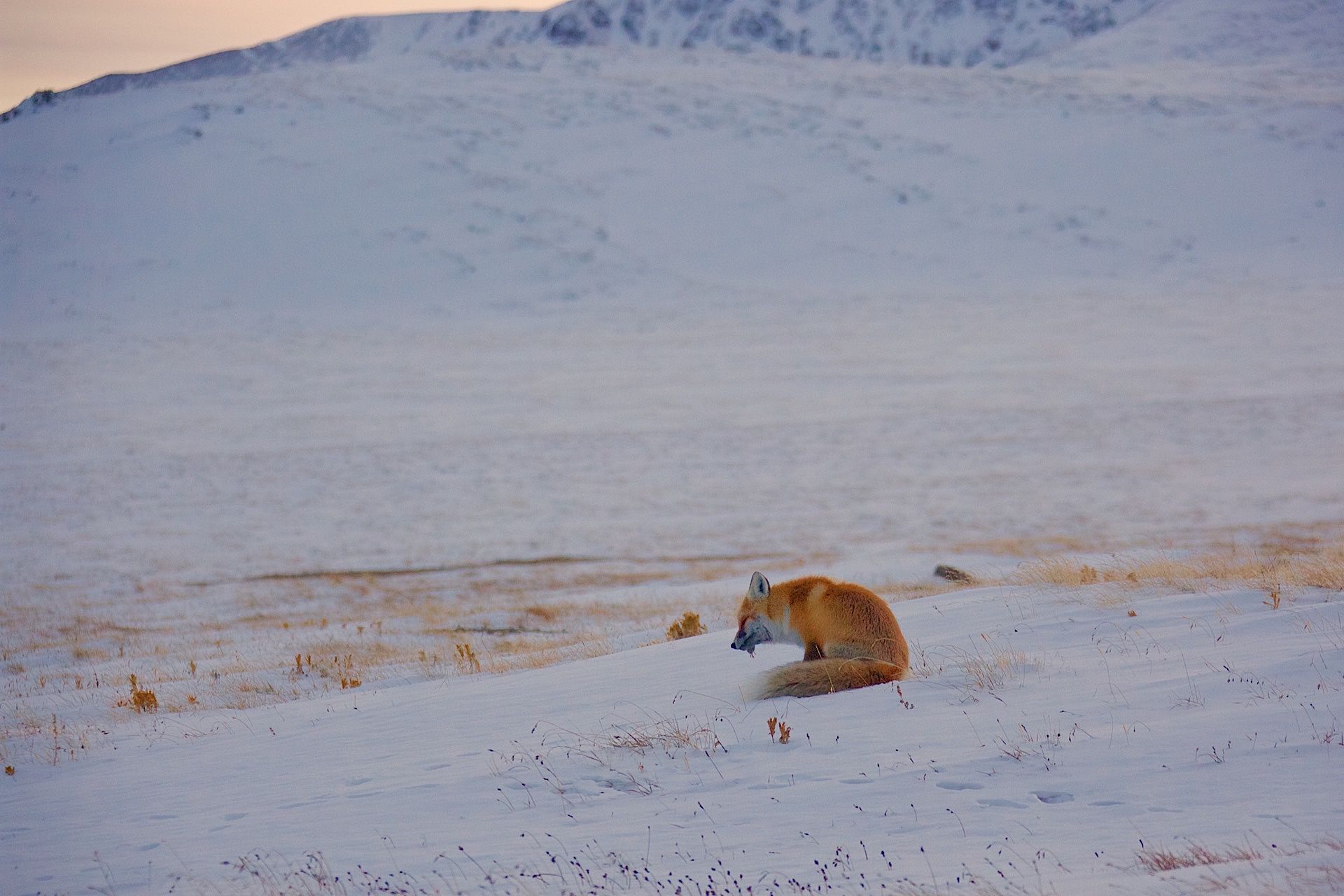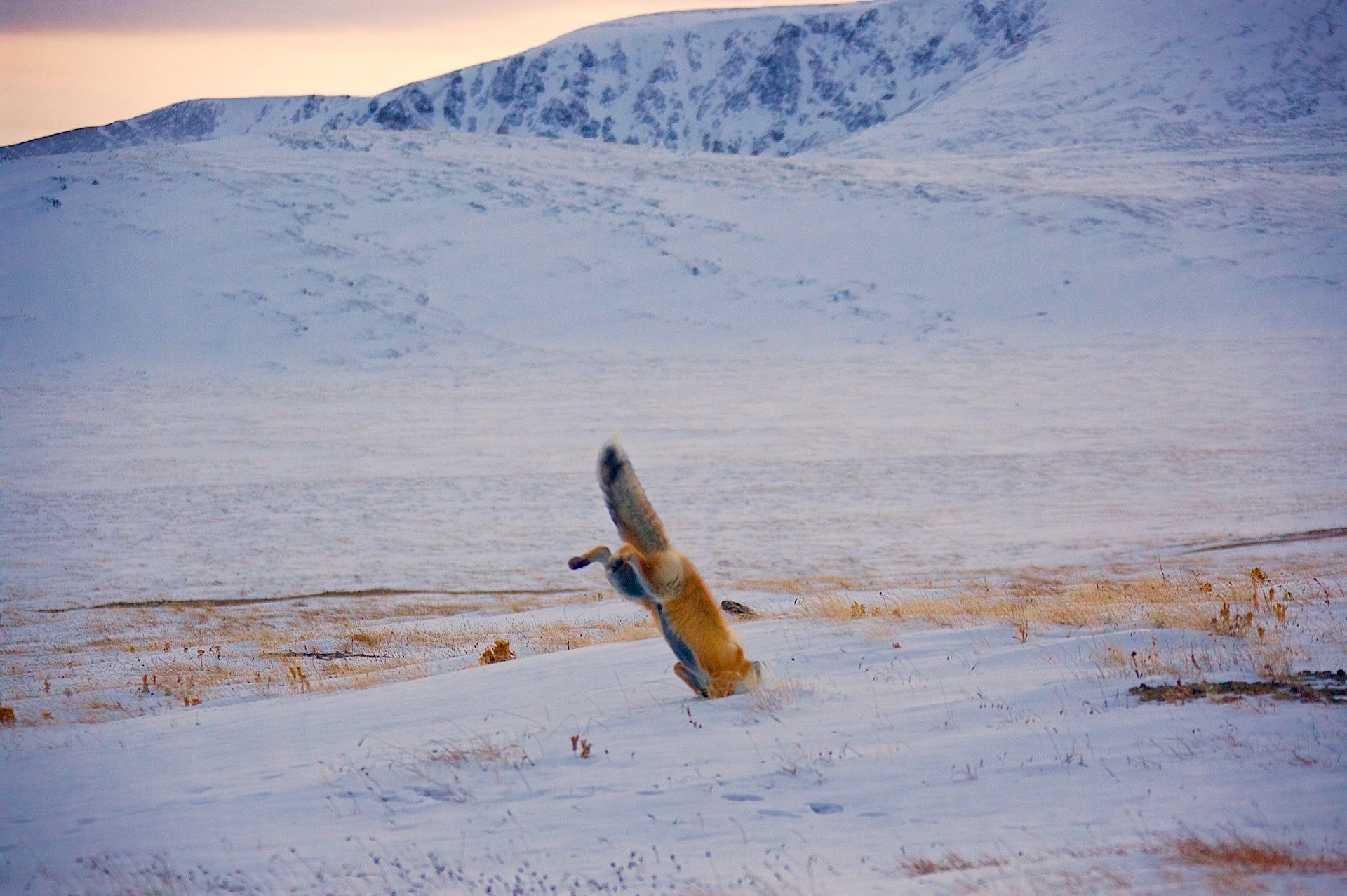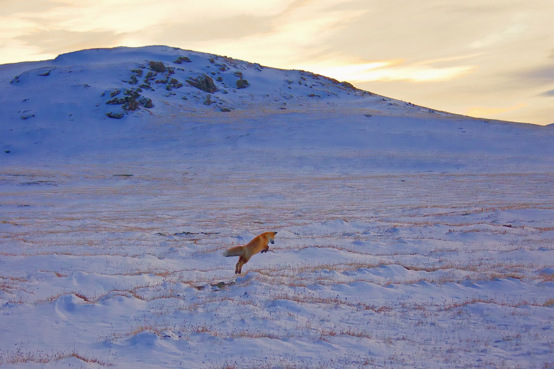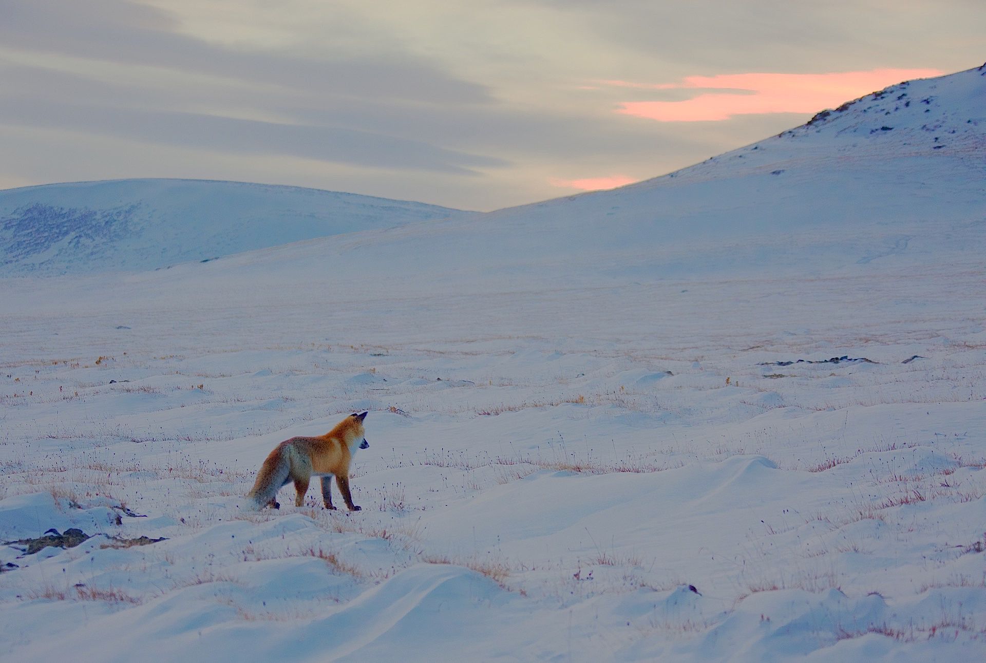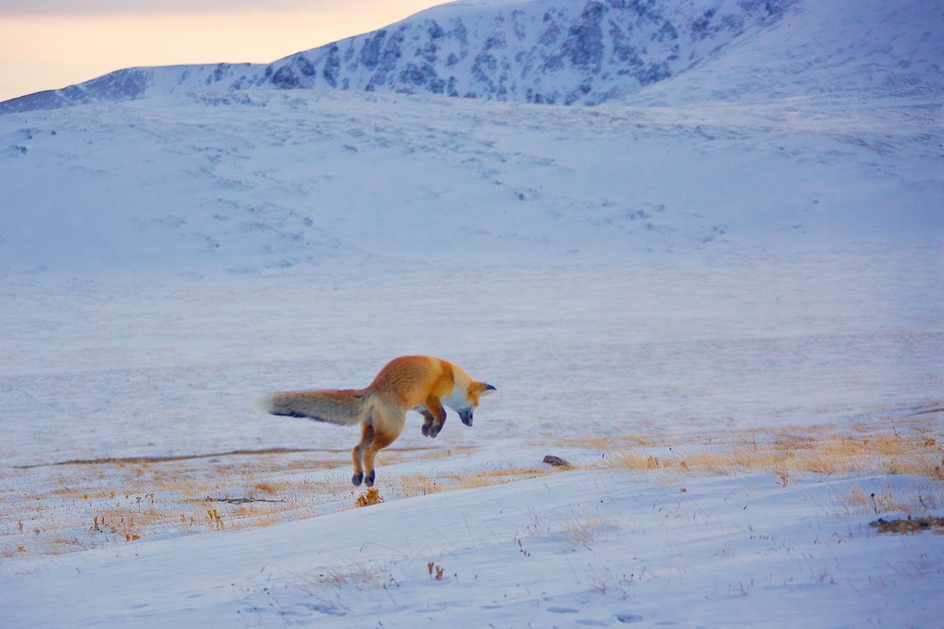 Мягкий и плотный свет в сгущающихся синих сумерках казалось делал тишину. В полной тишине,окрашеная в сумеречный свет ,на фоне седых гор мышковала молодая лисица. В такие минуты жизнь кажется вечной..