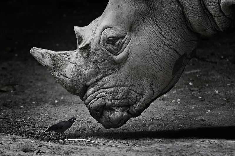 Эти птички называются волоклюй. Это носорожья птичка,обожает носорага более, чем других зверей, потому что на его огромном голом теле всегда имеется невероятное количество личинок. Это настоящая столовая для шустрой птицы, которая предпочитает вовсе не улетать от нее. Вот и восседает птица на носороге постоянно, путешествуя с ним. Она не только личный хирург, но и личный охранник зверя: если услышит какой-нибудь подозрительный шум, тут же поднимает крик и начинает клевать носорога в уши, предупреждая об опасности. Многие птицы склевывают паразитов с кожи животных, но хирургические вмешательства проводит на них только волоклюй. Вот такой пример симбиоза в природе. Фото сделано в январе 2016 г. в Сингапуре.