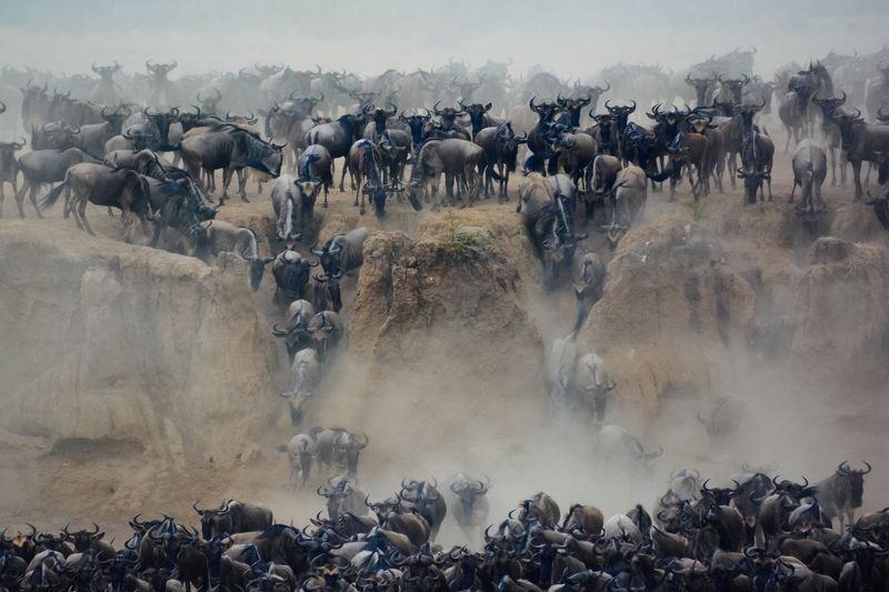 A massive herd of thousands wildebeests crossing a notorious crocodile infested river in the Serengeti, Tanzania.