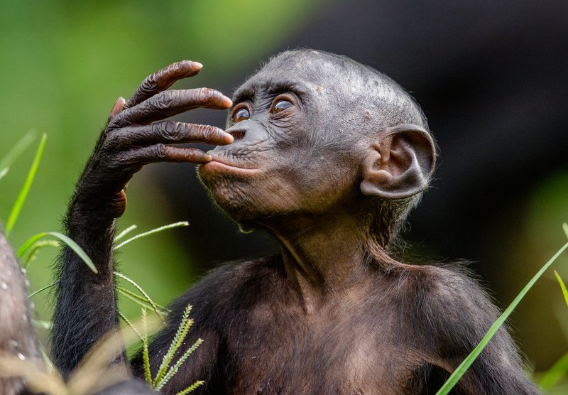 Детёныш бонобо. Бонобо — самые близкие к человеку из ныне существующих животных, при этом бонобо проявляет больше свойственных человеку поведенческих черт, чем обыкновенные шимпанзе. Кроме того, набор генов бонобо совпадает с набором генов человека на 98 %. Большая часть их общения осуществляется с помощью жестов и мимики. Многие выражения из их мимики — удивление, улыбки, умоляющая мимика и мимика утешения — такие же, как у людей. Демократическая республика Конго.
