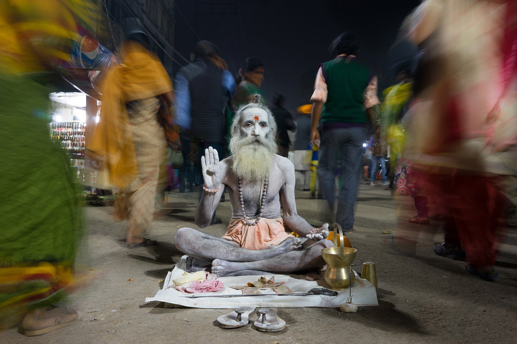 this photo has been shot at a roadside footpath during Gangasagar Transit camp , a huge gathering of pilgrims during winter in Kolkata , West Bengal . Here the 'Sadhubaba' ( the old holy man ) is asking for alms in exchange of blessing with a pinch of holy ash .