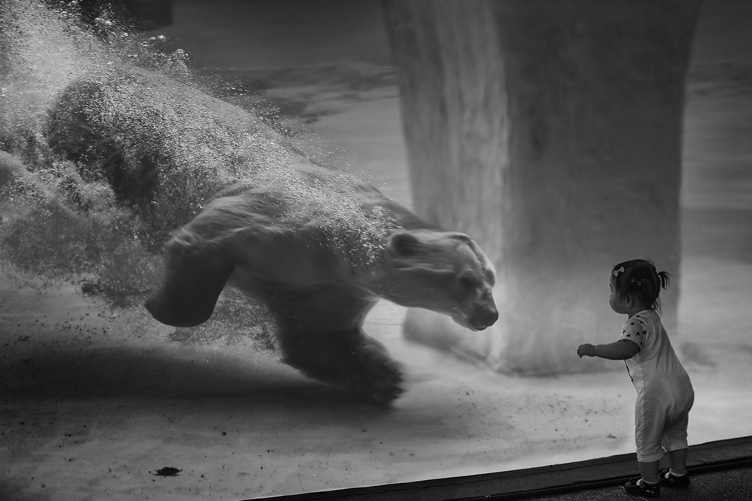 Зоопарк Сингапура-2016. Полярный медведь чаще всего лениво лежит на суше и греется на солнышке. И казалось бы, что ничего не может помешать этому. Но во время кормления, этот белый, пушистый "коврик", превращается в активного хищника, злого и беспощадного. Посмотреть на это зрелище, всегда собирается много людей. Девочка была так увлечена происходящим за стеклом, что стояла как заваражённая. The polar bear most of the time couches lazily on the land and catches rays of the sun. It seems nothing can bother him and distract from his relaxing pastime. Аt feeding time the bear changes from a still creature into a strong and ferocious predator. Lots of people always come to look at the process of feeding. A small girl was looking excitedly at what was going on behind the glass, standing in front of it as if enchanted.