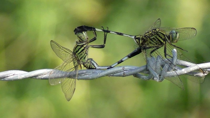 I was looking for a good subject that conveys a meaning. And while I was walking in the park, I found this pair of dragonflies near the border, on a barbwire, beautifully conveying the message, "Make Love, Not War!"