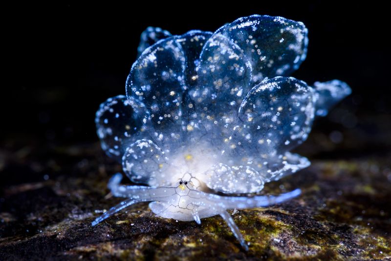 this is a little sea slug living in 15 meters deep coral reef. very hard to find it, this photo was taken at Romblon island where is a little island in the middle of the Philippines. it's only 5 cm size and it's body almost translucent. but if you find out the right way to set up your strobe position,it will show you the amazing details. many sparkling spot just like the crystal on it's body.