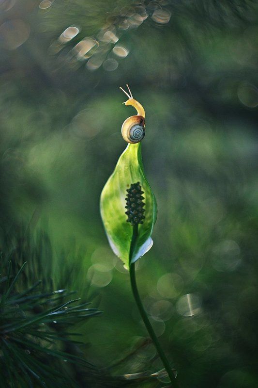 Улитка в траве тянется к белому цветку.