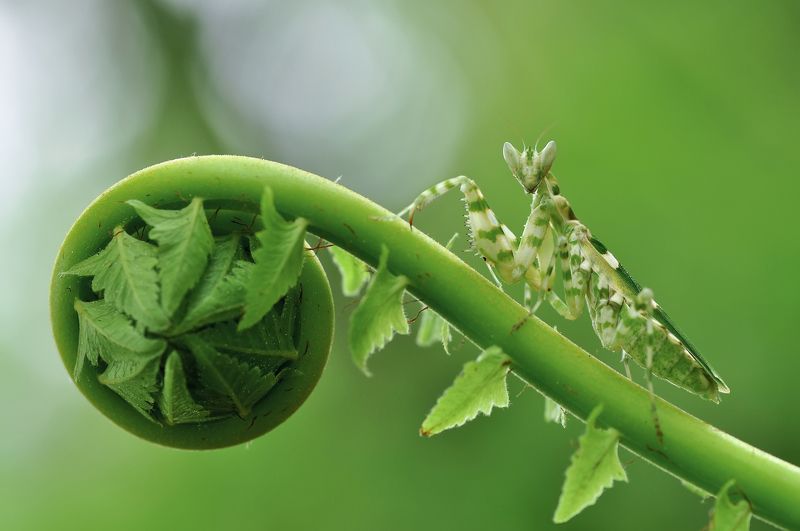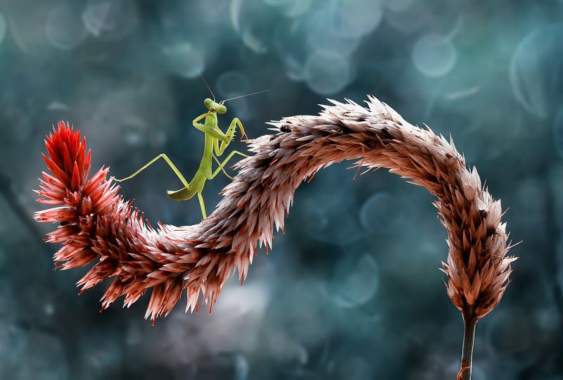 This small green Mantish is very beautiful, standing gracefully on a grass flower that is also very beautiful.such as a ship's captain is looking at the ocean