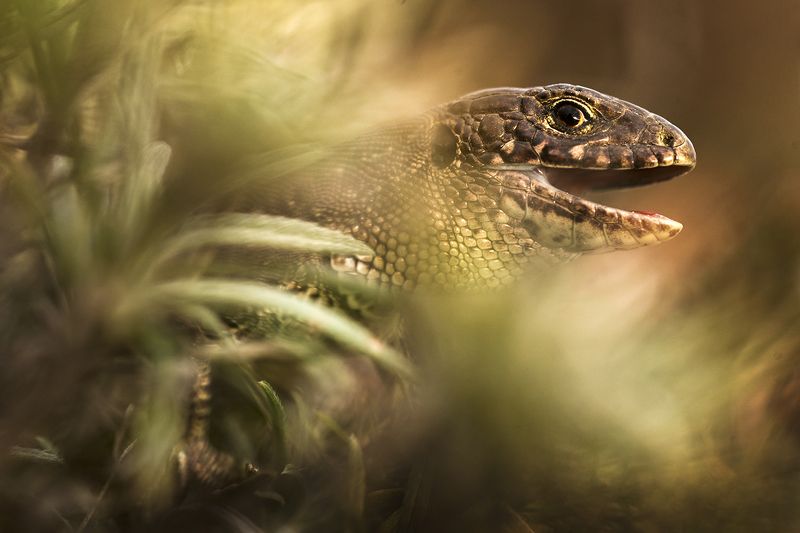 Прыткая ящерица. Снято сквозь траву с уровня земли. Воронежская область