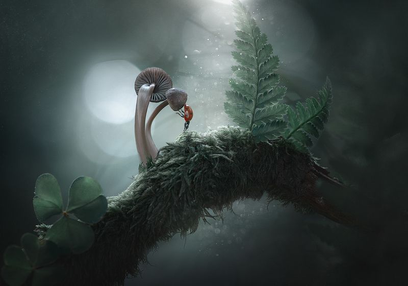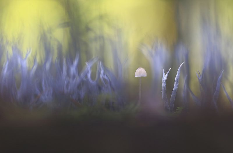 Фото сделано широкоугольным объективом из центра трухлявого пня. Подсветка 2 фонариками, баланс белого - люминисцентные лампы.