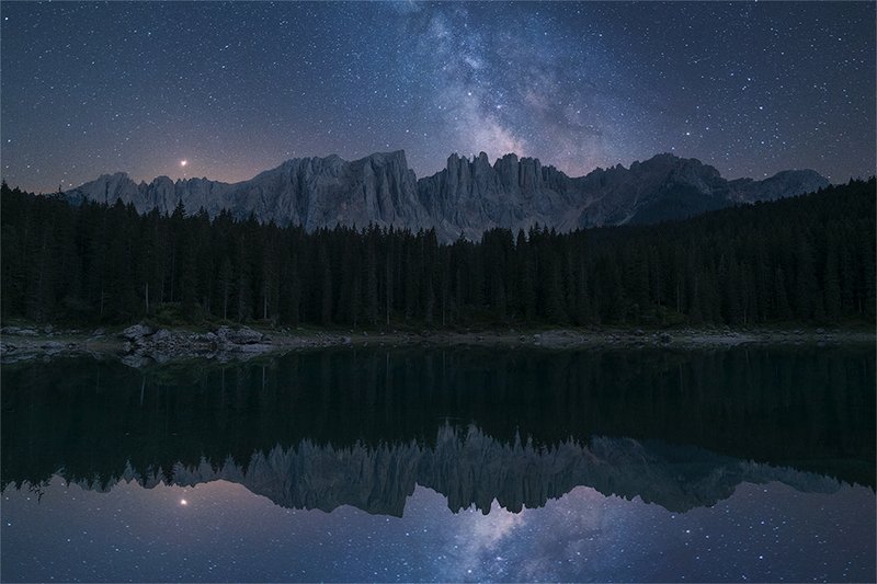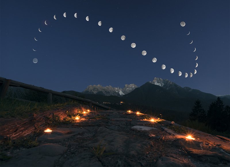 The position of the Moon has been resumed every 1,481 minutes, ie 24 hours and 41 minutes. For get a classic analemma, it would have been it is necessary to wait 24 hours and 51 minutes (the rhythm of the lunar month). There is a 10 minute gap. In this way his Moon is always a little "in advance" and this justifies the wider curve: the satellite in the photograph is in fact located a little further to the left of the typical position of the analemma. The advance, which at the end it is about 4 hours between the first day (in top right) and the last (bottom left), not has effect on the lunar phase recovered, at least for this that we can perceive from the ground (enlightenment of the satellite does not vary significantly in this time frame). So, except for the first shot (the one at the top right: as explained before, the chronological progression goes from right to left), the placement of the Moon in the heavenly vault is always farther from that classic. It is therefore a choice: the composition it does not represent the synodic month but "only" the lunar curve, reproducing something that exists really but that does not have a precise definition. For a question of correctness and clarity, I deliberately talked about "lunar curve" e not of "synodic curve" or "lunar analemma" just in reference to the longer time intervals short between shots. It will not be a classic analemma but it is nice.