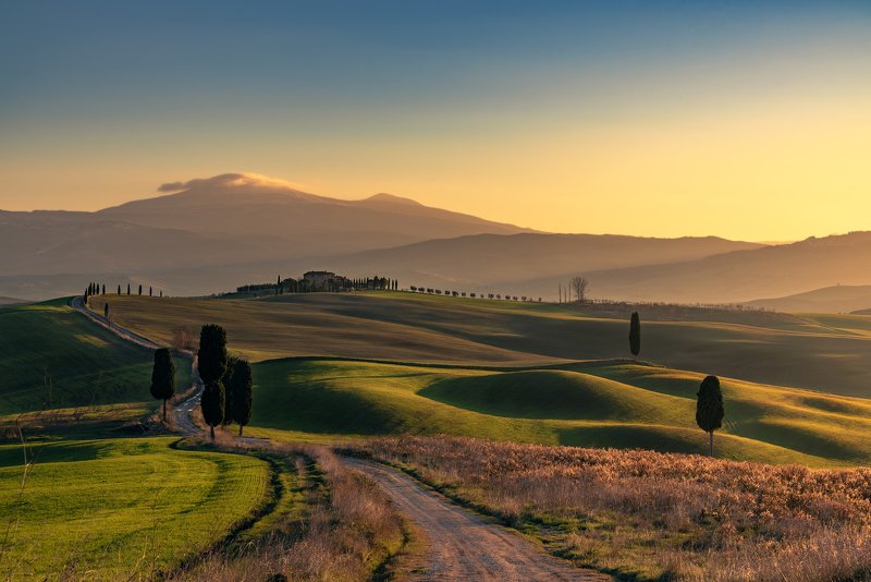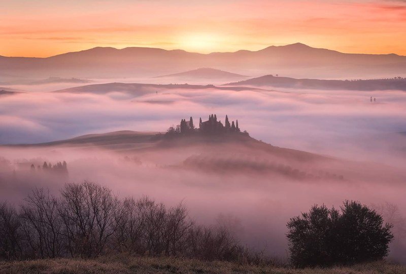 A photo taken at the first light of the day, at the locality Pienza, a small detail wrapped in fog, in the hills of the Val d'Orcia.