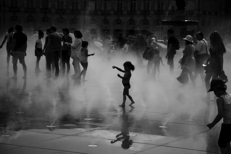 Bordeaux, Place de la Bourse, the square-mirror. During the summer the square is filled with people, tourists, children, who play and run on its surface, constantly wet to reflect the beautiful scenery of the square. Suddenly, the fog. Everything is wrapped in cotton wool, and those people, who were previously \"colours in the sun\", become shadows, shadows playing, running, playing, dancing... in that artificial fog that moves them away, that isolates them, at least for a while, from the real world.