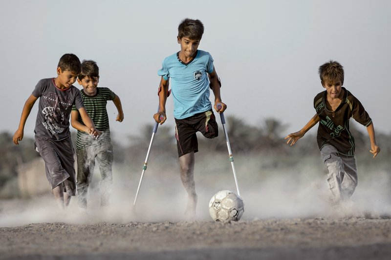 A group of children playing soccer mediated by a child with a leg fractured during an explosion in Iraq, despite the impediment, but Egypt to challenge life