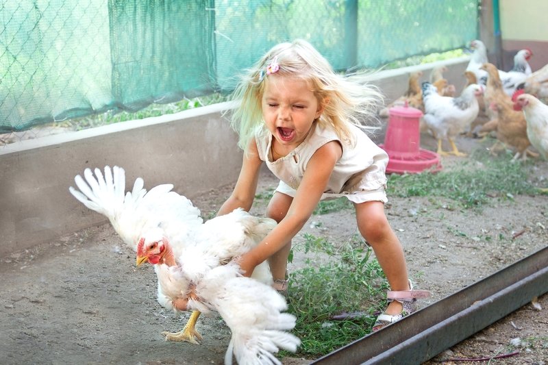 моя маленькая дочь Ксения ничего не боится она бесстрашна.На каникулах в сеое у бабушки часто ей помогала кормить курей. и так увлеклась,что ходила 4раза в день и носила травку,корм...и тут я тайком взяла фотоапарат....фотосессия за 7 минут принесла мне 35 отличных интереснейших кадров с моей маленькой "Жанной Д'арк".