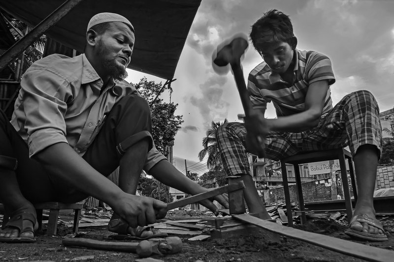 In this picture this people making boat by there traditional system .