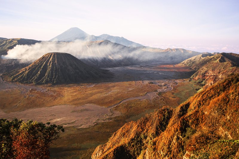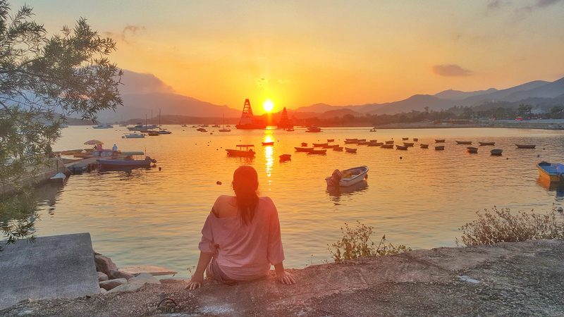 The sun rises behind the peaks and aligns the river, therefore the shadows of the peaks can be projected onto the water. The boats cruise in the river and make the water wrinkled and sparkling.