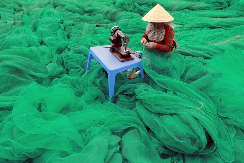 A woman is drying incense sticks. Everyday, she worked for 8 hours to earn about 160 thousand VND (equivalent 7 usd), a low income. The image of a woman wearing a hat is working hard as a symbol of Vietnamese women in the suburbs and poor countryside. Photographed at Quang Phu Cau (Hanoi, Vietnam), a craft village has a tradition of making incense for hundreds years.